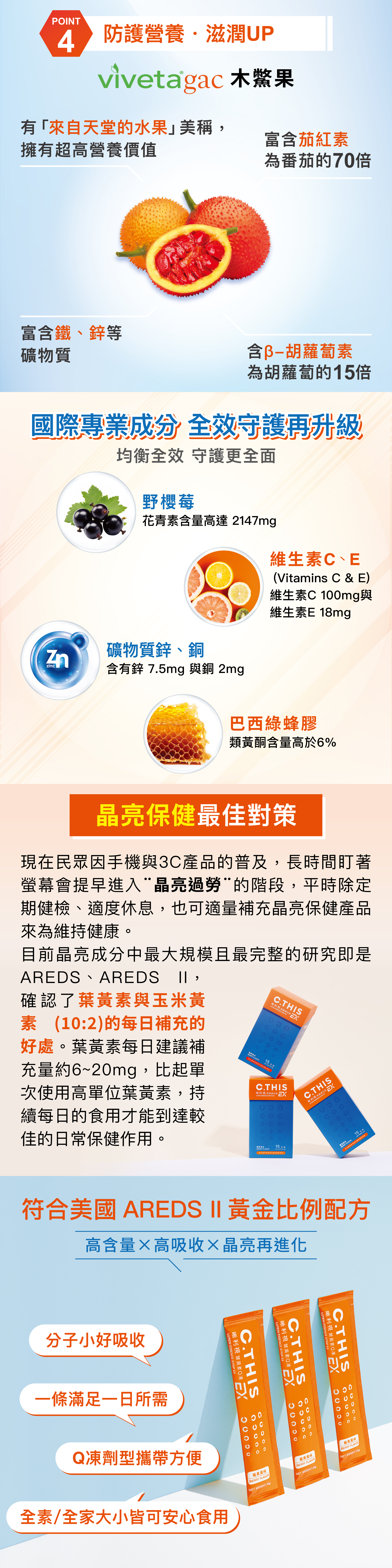 成分 | 水、D-木糖醇(甜味劑)、野櫻莓濃縮汁、藍莓濃縮汁、刺槐豆膠、香料、玉米糖膠、抗壞血酸(維生素C)、葉黃素(金盞花萃取物)(辛烯基丁二酸鈉澱粉、乾燥葡萄糖漿、蔗糖、葉黃素、L-抗壞血酸鈉(抗氧化劑)、水)、紅藻萃取物(辛烯基丁二酸鈉澱粉、紅藻萃取物(含藻紅素)、二氧化矽)、維生素E(乙酸dl-α-生育醇酯(維生素E)、乾燥葡萄糖漿、辛烯基丁二酸鈉澱粉、二氧化矽)、葡萄糖酸鋅、金盞花萃取物(含玉米黃素)(麥芽寡糖、阿拉伯膠、金盞花萃取物(含玉米黃素)、混合濃縮生育醇(抗氧化劑)、L-抗壞血酸棕櫚酸酯(抗氧化劑))、檸檬酸、洋菜膠、藻粉(含DHA)(乾燥葡萄糖漿、DHA藻油、辛烯基丁二酸鈉澱粉、D-甘露醇、葵花油、抗壞血酸鈉(抗氧化劑)、脂肪酸甘油酯、多磷酸鈉、磷酸鈣、香料、混合濃縮生育醇(抗氧化劑)、卵磷脂、L-抗壞血酸棕櫚酸酯(抗氧化劑))、木鱉果假種皮凍乾粉(木鱉果假種皮、 玉米來源可溶性纖維 、海藻糖、 混合濃縮生育醇(抗氧化劑))、葡萄糖酸銅、蔗糖素(甜味劑)、巴西綠蜂膠萃取物(木薯澱粉、綠蜂膠萃取物) |